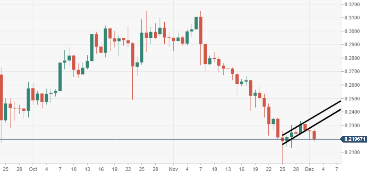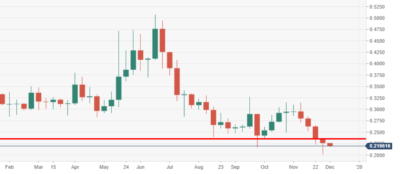 The price is running at five consecutive weeks in the red, critical weekly support was breached at $0.2350.