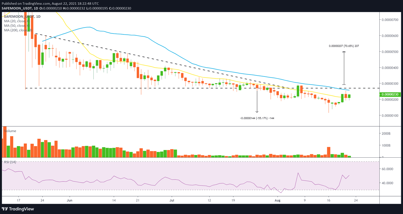 SafeMoon price fell 44% at the August 16 low, amping the anxiety in SAFEMOON speculators, but it staged a significant rebound, closing down only -7.69%. The digital coin proceeded to log three consecutive tight closes before the 27.32% jump on August 20, triggering the bullish hammer candlestick pattern and closing above the 20-day SMA at $0.00000214.