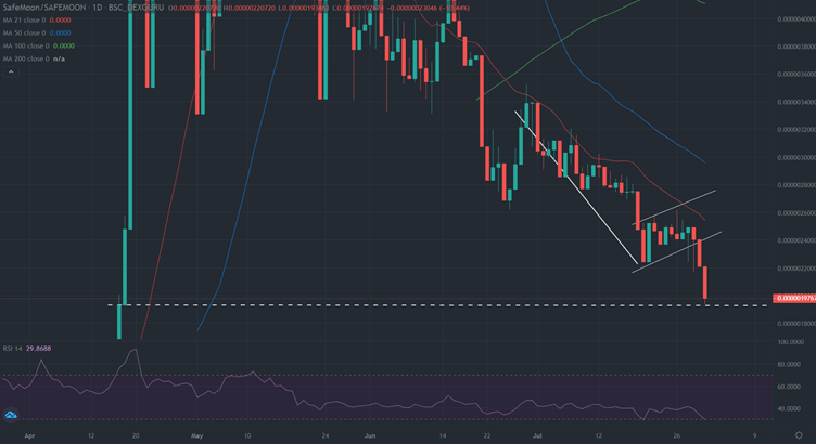 The consolidation that followed SAFEMOON’s downtrend from the June 29 high of $0.00000352 had carved out a bear flag pattern on the daily chart.