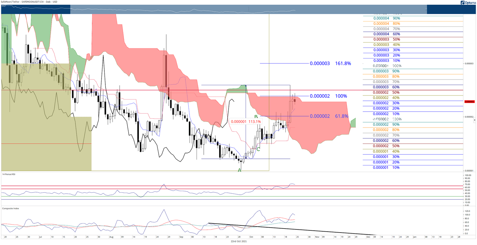 Despite the strong rally that SafeMoon price has experienced, it is still massively underperforming the broader cryptocurrency market. While many cryptocurrencies hit new all-time highs and continue to form new all-time highs, SafeMoon is just coming off of making new all-time lows. If momentum remains strong, then bulls may be able to push SafeMoon above the Cloud and to the profit target level at the 161.8% Fibonacci expansion at $0.0000030.