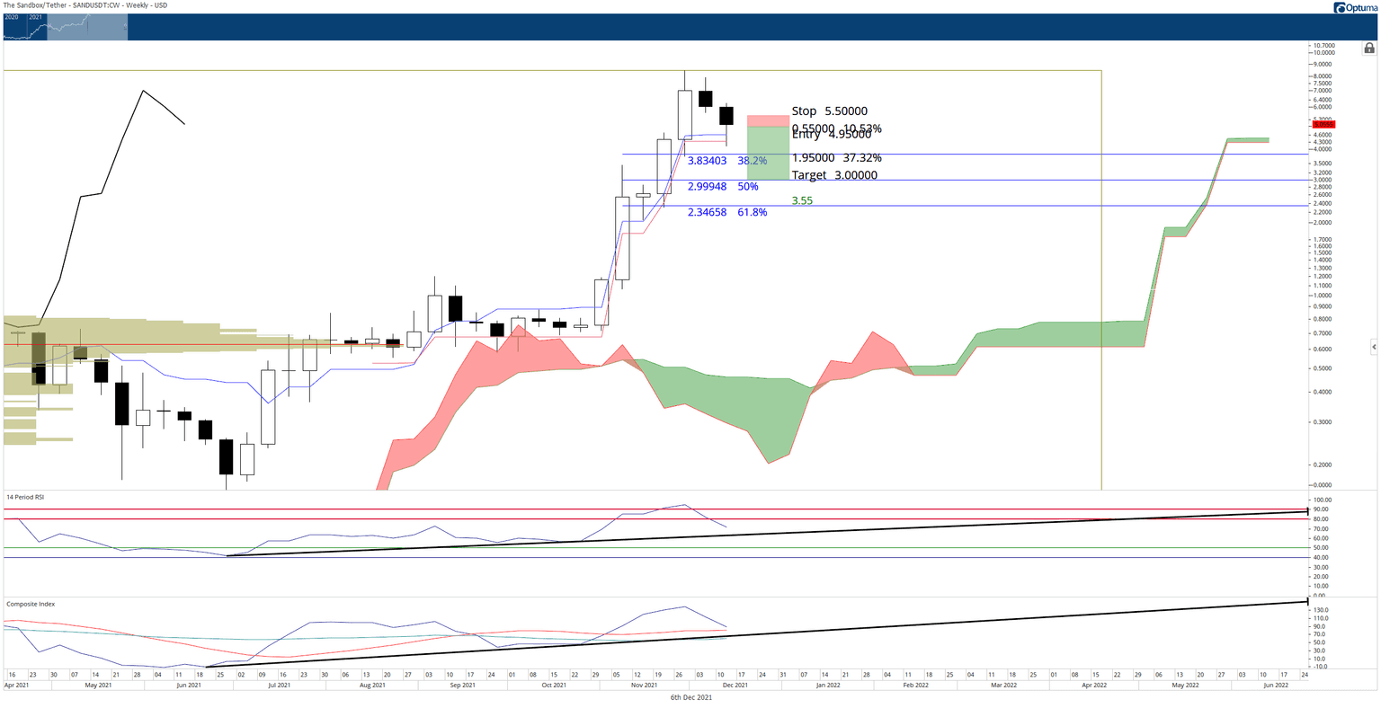 The Composite Index is the most vital oscillator to watch. If the Composite Index crosses below its moving averages and the trendline, a swift collapse in Sandbox price is likely to occur. The projected support structure is the 50% Fibonacci retracement at $3.00.