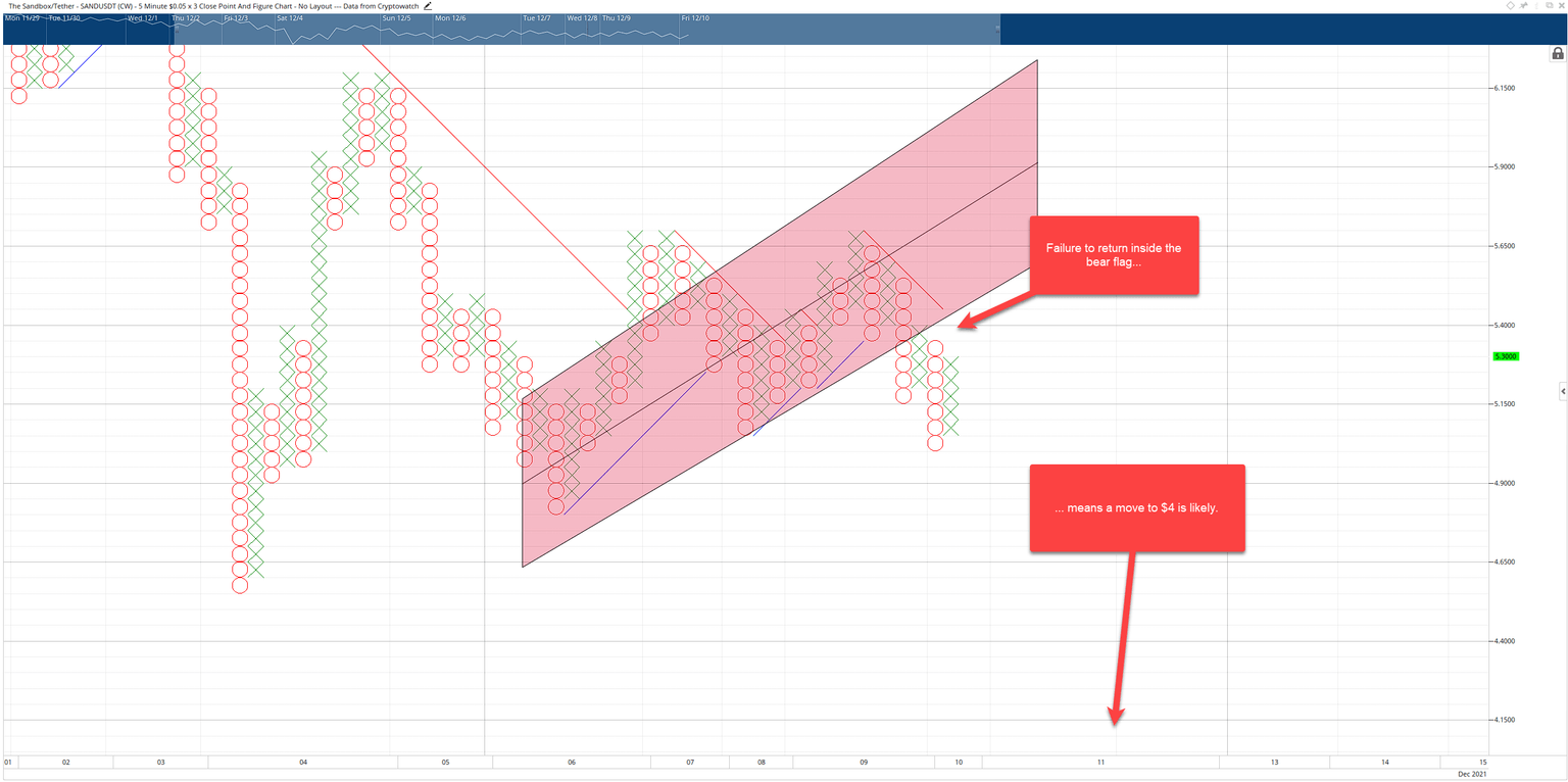 Prices continue to fall in a reasonably steady manner. Sandbox broke down below a bear flag on its $0.05 3-ox reversal chart and faced some intense selling pressure until buyers stepped in during the early Friday trading session. Bulls are attempting to test the conviction of sellers by making a move to test the breakdown below the bear flag.