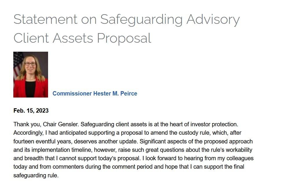 Commissioner Hester Peirce’s statement in response to the proposed rule changes on investment adviser custody set out by SEC Chairman Gary Gensler. Source: SEC.