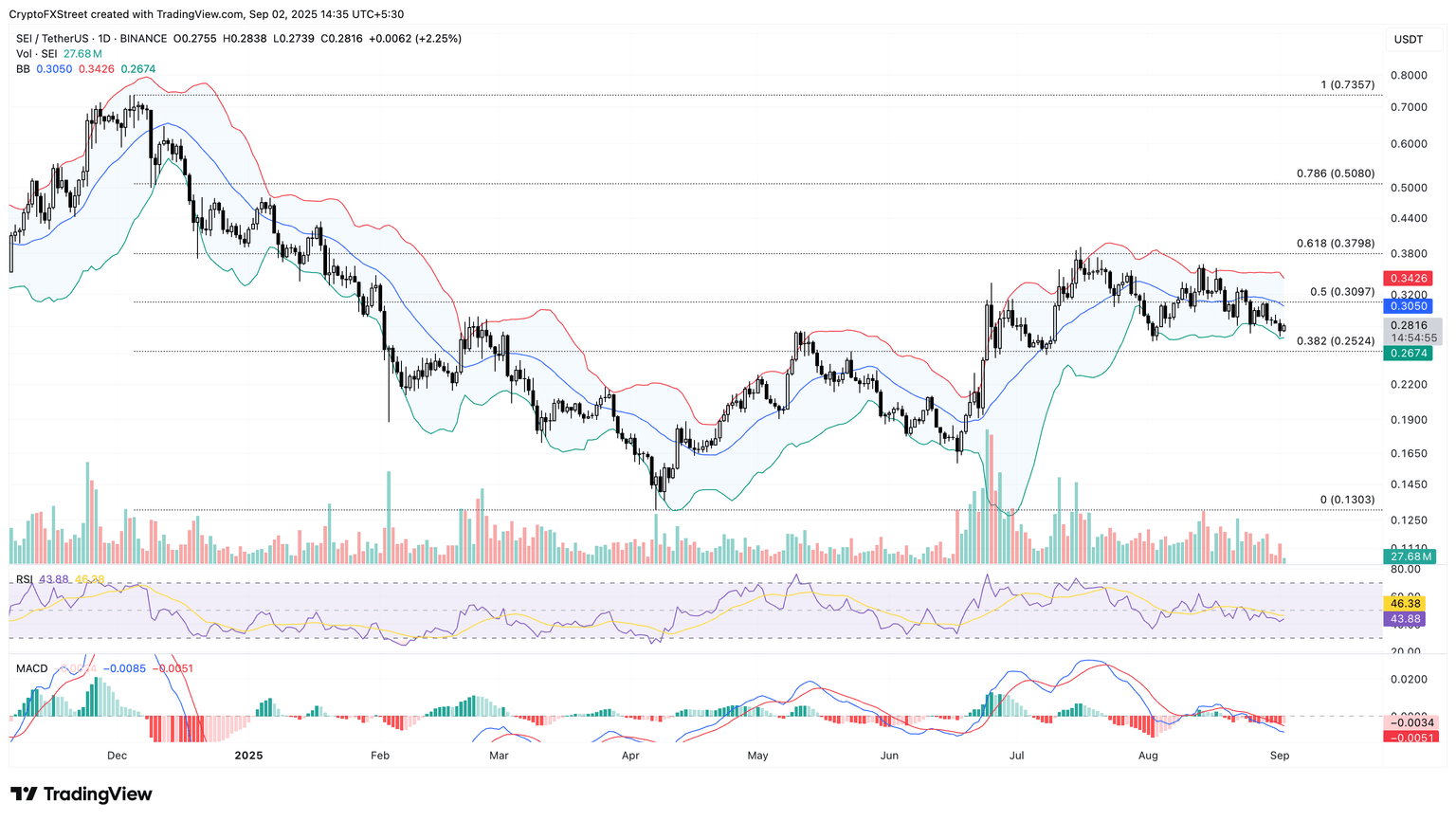 SEI rebounds from the lower Bollinger Band on the daily chart, avoiding a drop to the 38.2% Fibonacci level, which is drawn from the $0.7357 peak from December 5 to $0.1303 low from April 7, at $0.2524. The Bollinger Bands are moving sideways, reflecting a low-volatility contraction phase, while the lower band provides support, hinting at a potential bounce back.