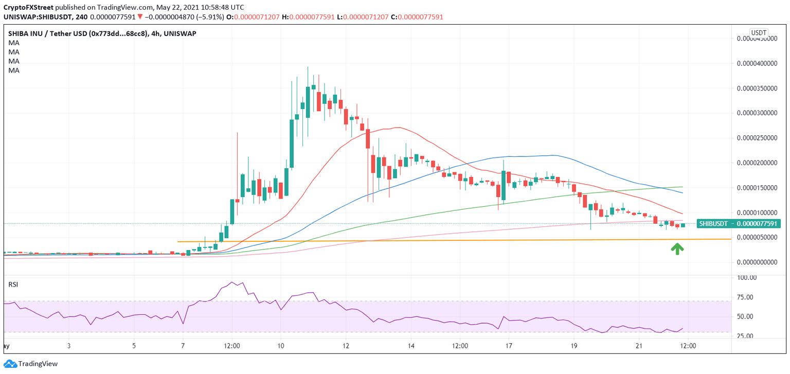 At the time of writing, Shiba Inu is trading around $0.0000070, having breached the last line of defense for the bulls, which is the critical 200-simple moving average (SMA) on the four-hour chart. That level is now seen at $0.0000084.
