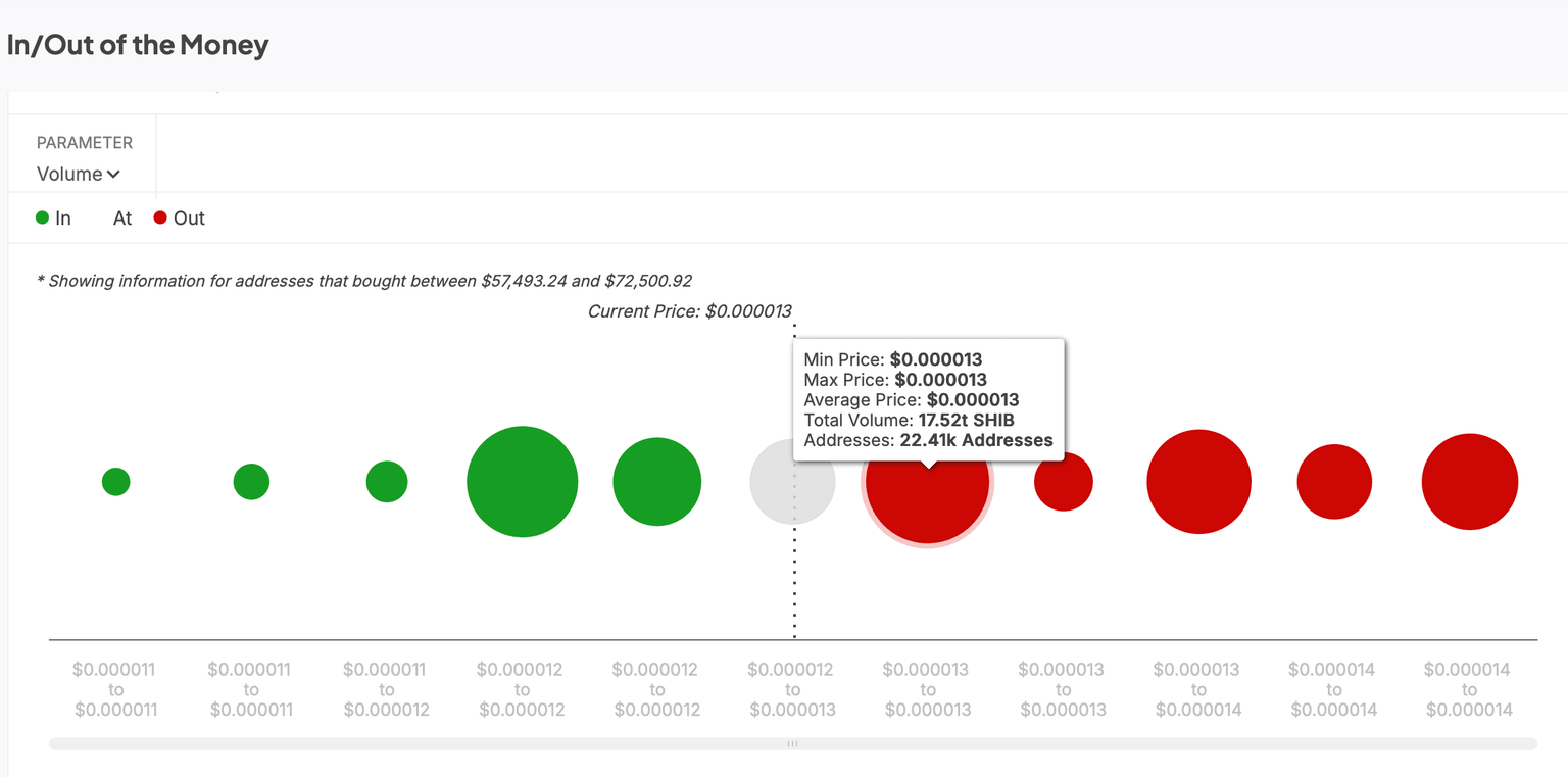 IntoTheBlock's In/Out of Money Around Price (IOMAP) on-chain model directs traders to focus on the robust resistance zone around $0.00001300. Here, approximately 22,400 addresses previously purchased 17.52 trillion SHIB.