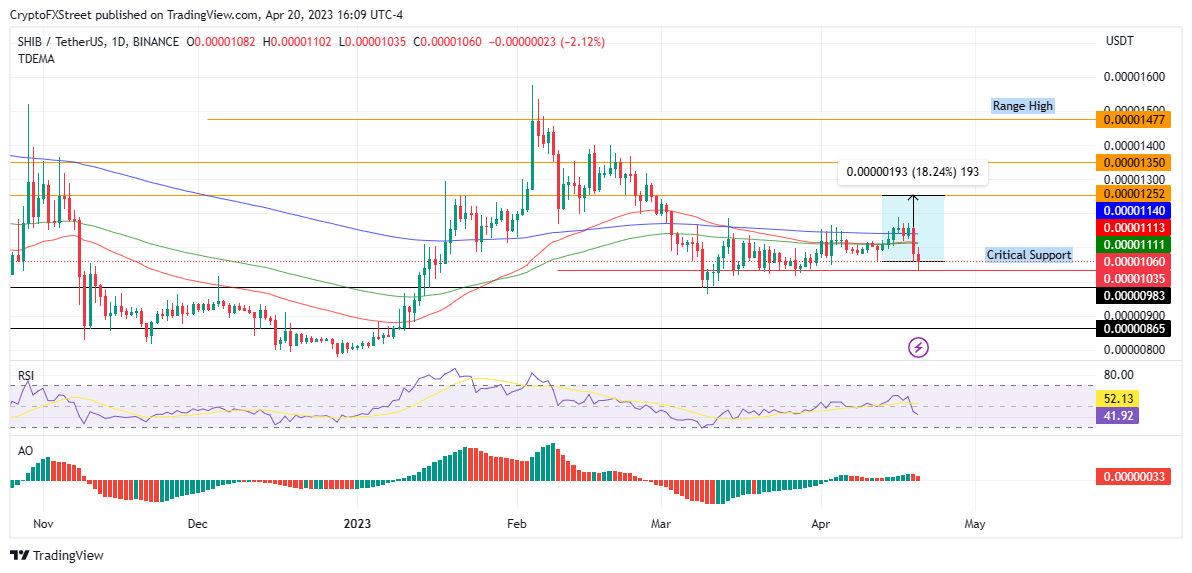 At the time of writing, Shiba Inu price is $0.0000106, sitting atop the critical support level at $0.0000103. The meme coin appears to be coiling up for an upswing of about 20% to $0.0000125 before a possible extension to the $0.0000147 range high.