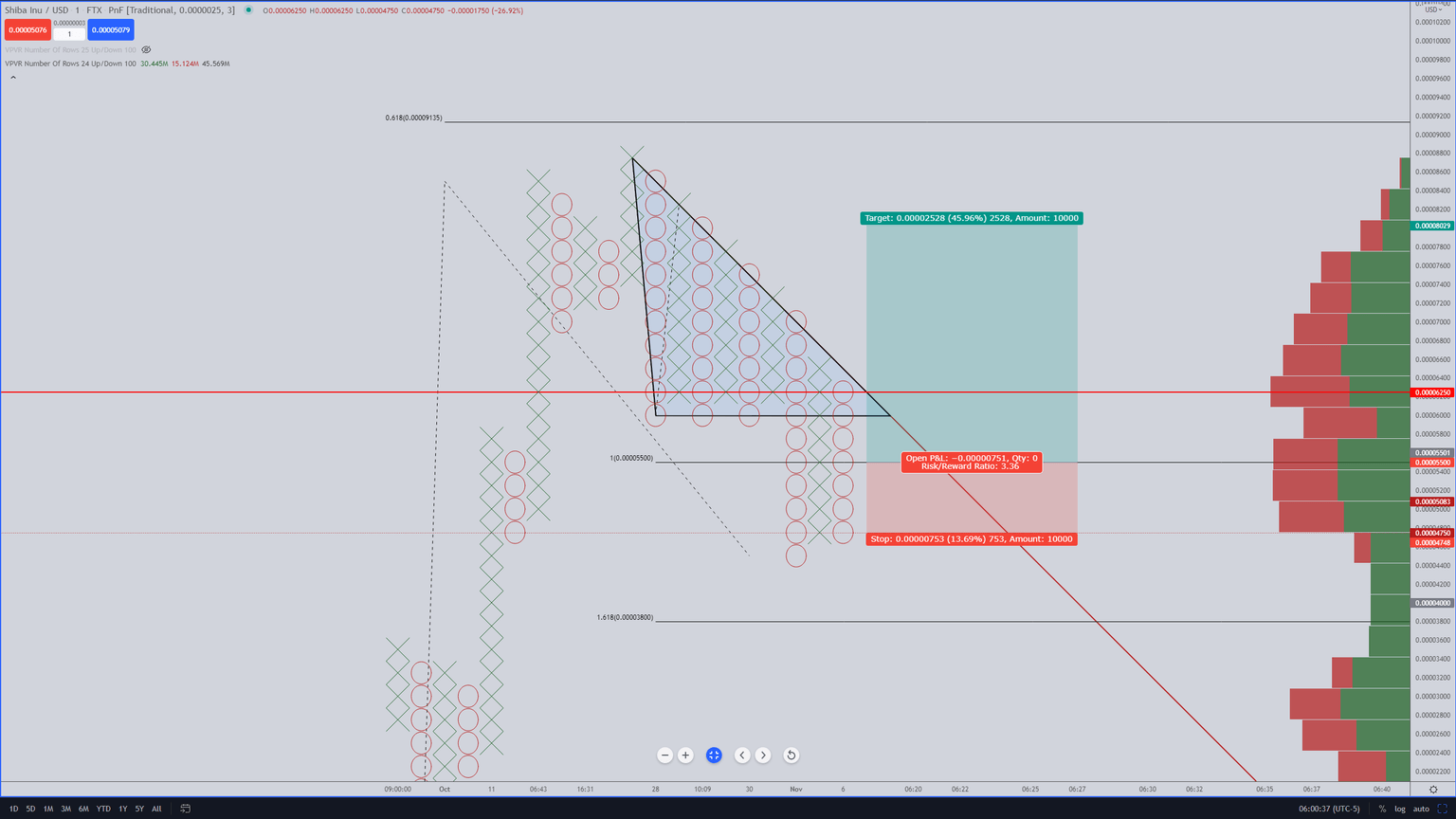Shiba Inu price action is developing one of the most sought-after bearish Point and Figure patterns: the Bearish Catapult. The bearish Catapult forms after a breakout below a triple-bottom, followed by a slight bounce by buyers, and then a breakout below a double-bottom. There is a theoretical short idea with a sell stop order at $0.0000400, a stop loss at $0.0000550, and a profit target at $0.0000100. Ultimately, Shiba Inu bulls must hold that $0.0000400 value area, or Shiba Inu could face a very violent flash crash. However, in the event of a breakout below the double-bottom, downside risk may be limited to the $0.0000150 value area.