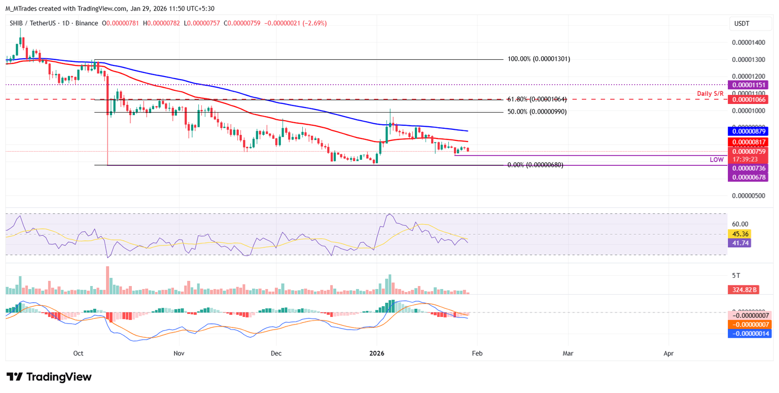 Shiba Inu (SHIB) price slips below $0.0000077 on Thursday after correcting the previous day. Bearish sentiment is further strengthened as holders offload SHIB, increasing selling pressure and reducing Open Interest (OI) in the derivatives market. On the technical side, weakening momentum suggests the downside pressure on the meme coin will continue.