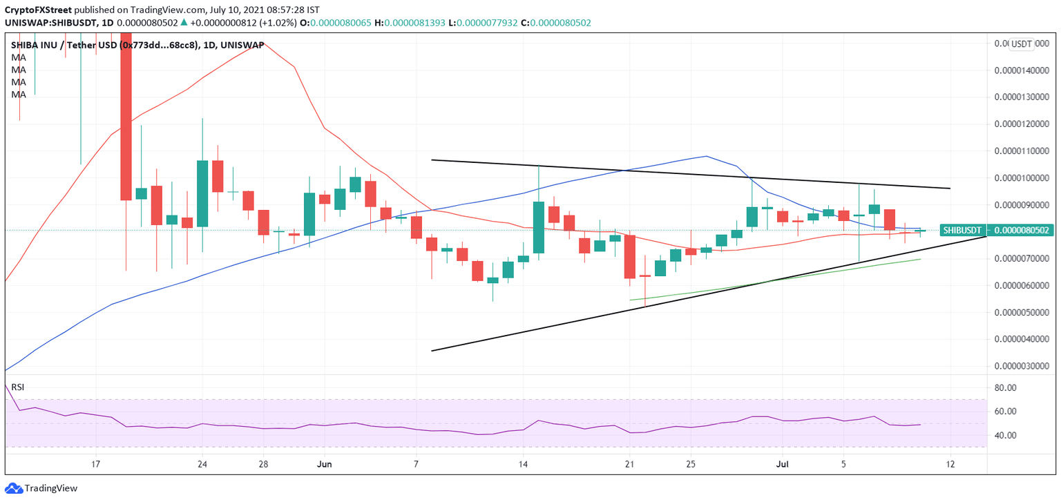 A daily closing below the 21-DMA is needed for SHIB price, in order to resume the downtrend towards the rising trendline support at $0.00000731.