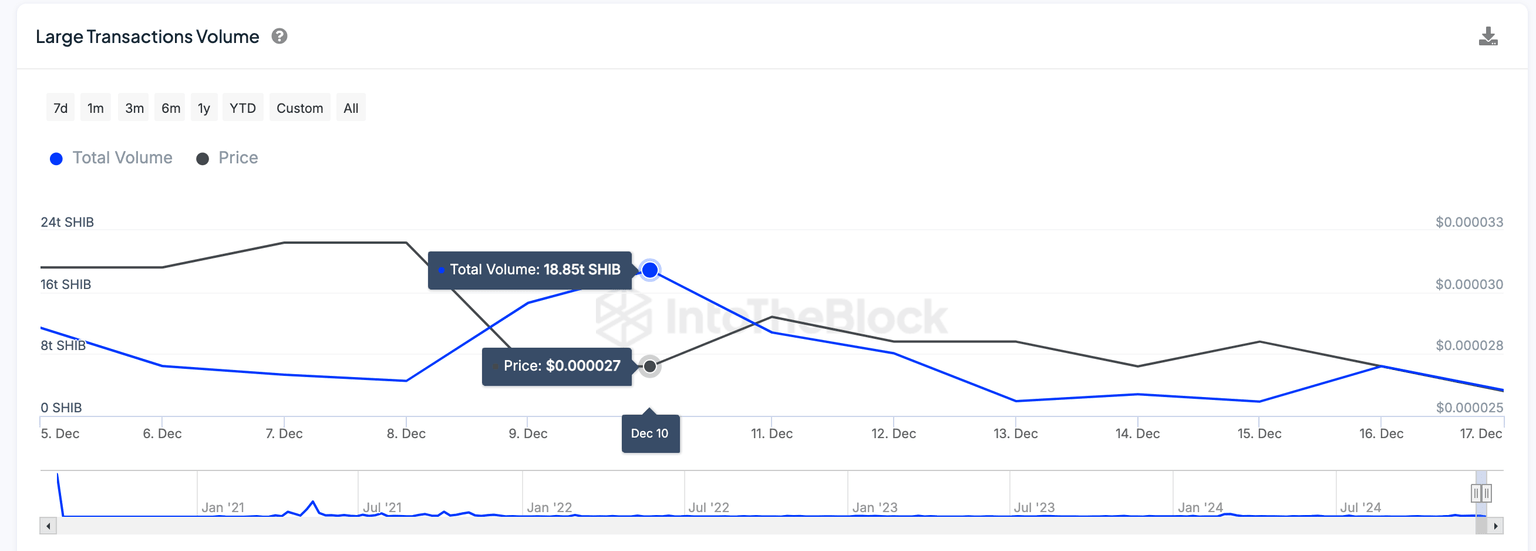 IntoTheBlock's data underscores this shift, revealing a sharp decline in SHIB’s large transactions.