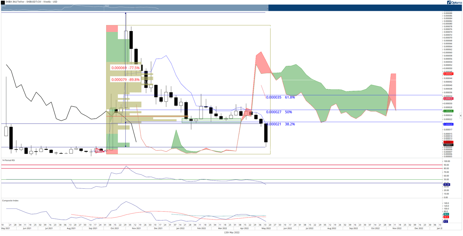 From an Ichimoku perspective, Shiba Inu price is oddly neutral. On the weekly Ichimoku chart, SHIBA is one of the few major altcoins that has not generated an Ideal Bearish Ichimoku Breakout – SHIBA would need to close below all-time lows to trigger that setup.