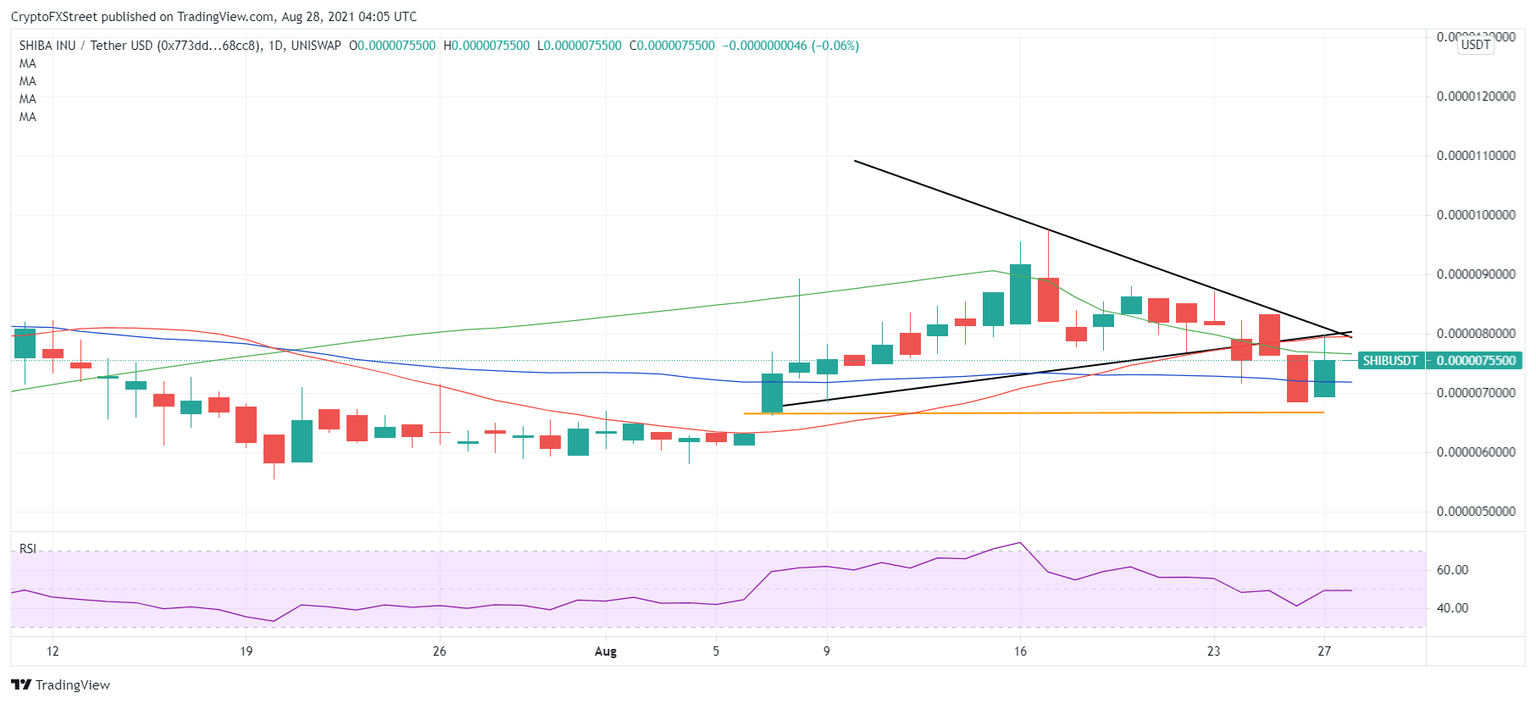 The SHIB bulls bounced off the key support at the August 9 low of $0.00000685, around where the horizontal (orange) trendline support aligns.