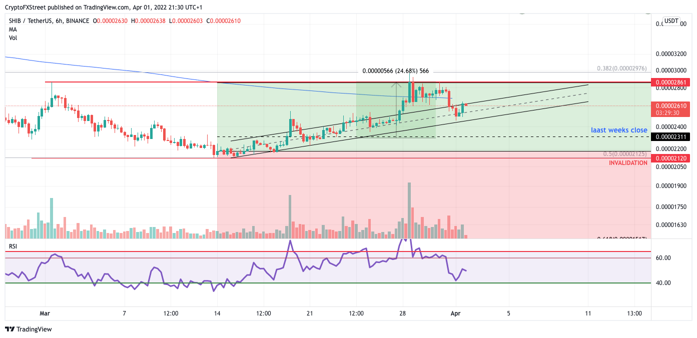 SHIB price provides bullish confluence on the 6-hour chart. For one, the daily trend channel was successfully breached during the 15% rally. Secondly, the current price of $0.0002630 is above the median line of the parallel channel. Lastly, The Relative strength index shows a bottom at 40. With these bullish signals, bears looking to short the notorious meme coin should be careful.