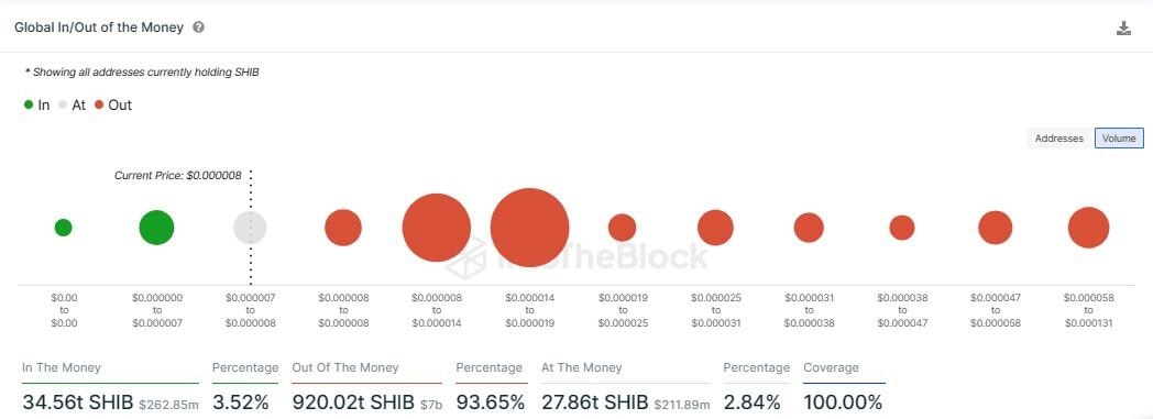While the ascent seems plausible for SHIB, abounding overhead selling pressure will not allow it. According to the on-chain metric Global In/Out of the Money (GIOM) from crypto intelligence tracker IntoTheBlock, at the current price of $0.00000769, 93.65% of the addresses are currently underwater (out of the money). Only 3.52% is sitting on unrealized profit (in the money) while 2.84% are breaking even (at the money).