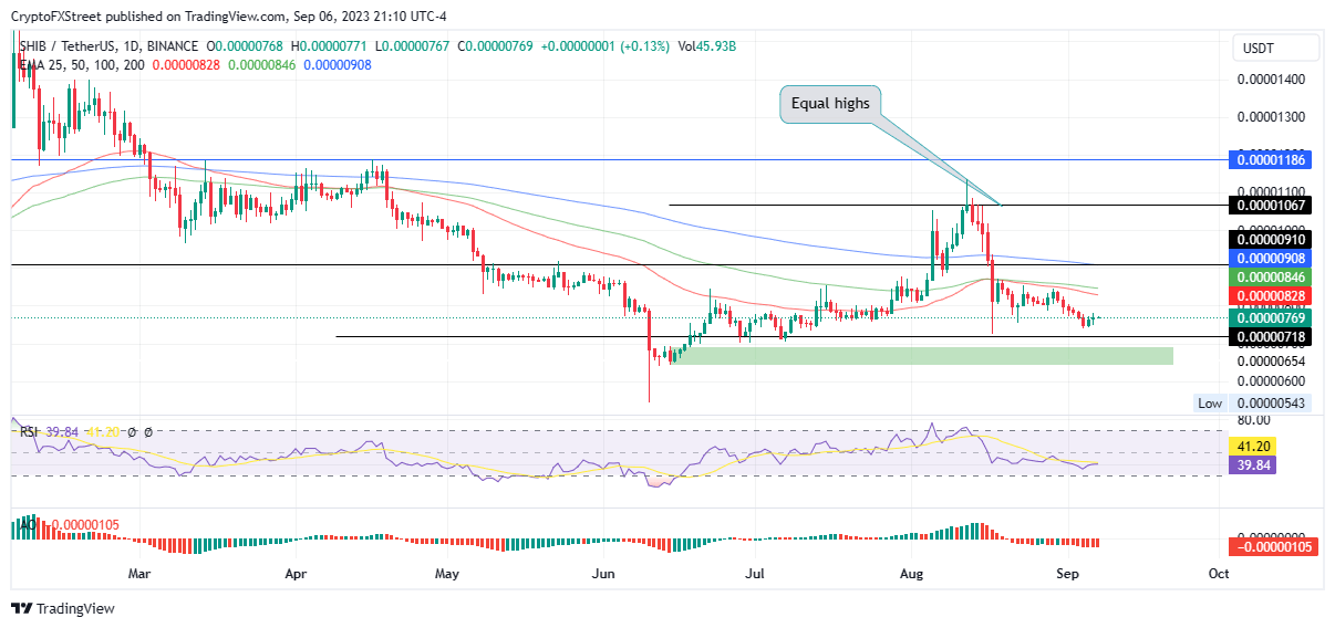 In a highly bullish case, Shiba Inu price could overcome this barricade, and the next level at $0.00000846 before confronting the resistance confluence between the horizontal line and the 200-day EMA at $0.00000908. Such a move would denote a 20% climb above current levels.