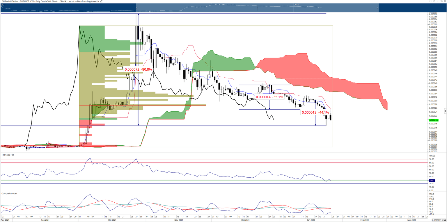 The nearest Ichimoku support level for Shiba Inu is on the weekly Ichimoku chart. Senkou Span A at $0.000007 is the closest Ichimoku support level for Shiba Inu price. However, a massive bounce could occur at any moment. The daily Composite Index has hit new all-time lows. At the same time, the Relative Strength Index is right on top of the first oversold level in a bear market at 30.