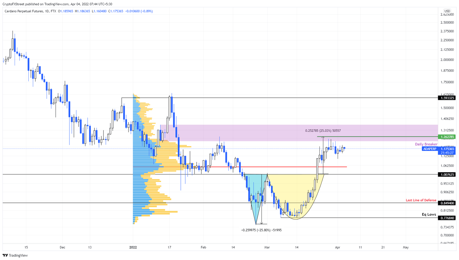 Cardano price action from February 19 to March 23 set up a V-shaped valley known as “Adam.” This move was followed by a rounded bottom formation referred to as “Eve”. The Adam and Eve formation is a bottom reversal pattern that forecasts a 25% upswing, determined by measuring the depth of the valley and adding it to the breakout point at $1.