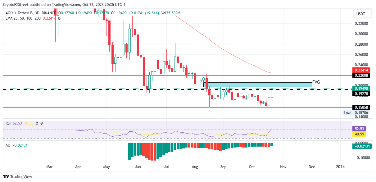 SingularityNET (AGIX) price is bullish, up almost 25% from the October 19 low of $0.1570 on the three-day chart below. The surge has AGIX confronting the $0.1927 resistance with the potential for more gains, save for the supply pressure expected on October 28.