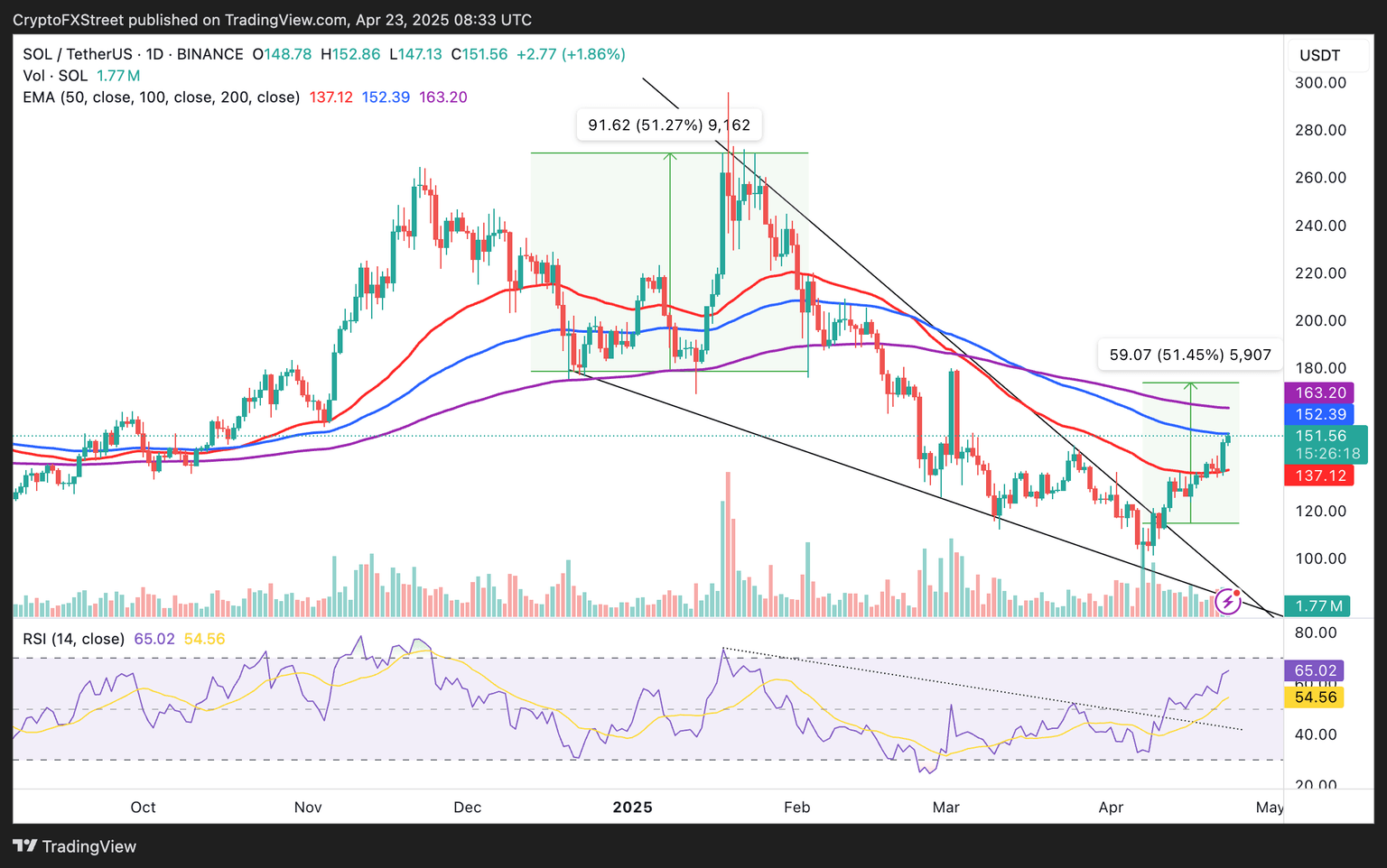 Solana's price continues to extend its recovery following the breakout from a falling wedge pattern on April 11. The smart contracts token surged, stepping above the 50-day Exponential Moving Average (EMA), before reclaiming the $150 psychological level on Wednesday.