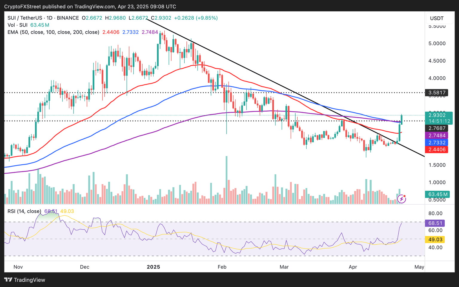 Sui's price surges over 9% on the day, exchanging hands at $2.93 at the time of writing. The layer-1 token broke above a 4-month descending trendline highlighted on the daily chart below, reversing the trend and paving the way for another rally, with the token now eyeing its all-time high of $5.35, achieved in January.