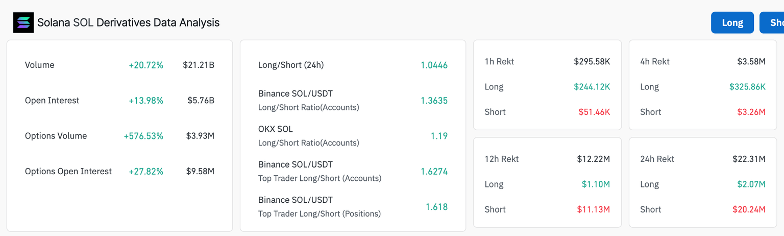 According to Coinglass, SOL's Open Interest (OI) has increased by 13.98%, reaching $5.76 billion over the last 24 hours. Short position holders experienced a significant jump in liquidations, up to $20.24 million, compared to $2 million in long positions.