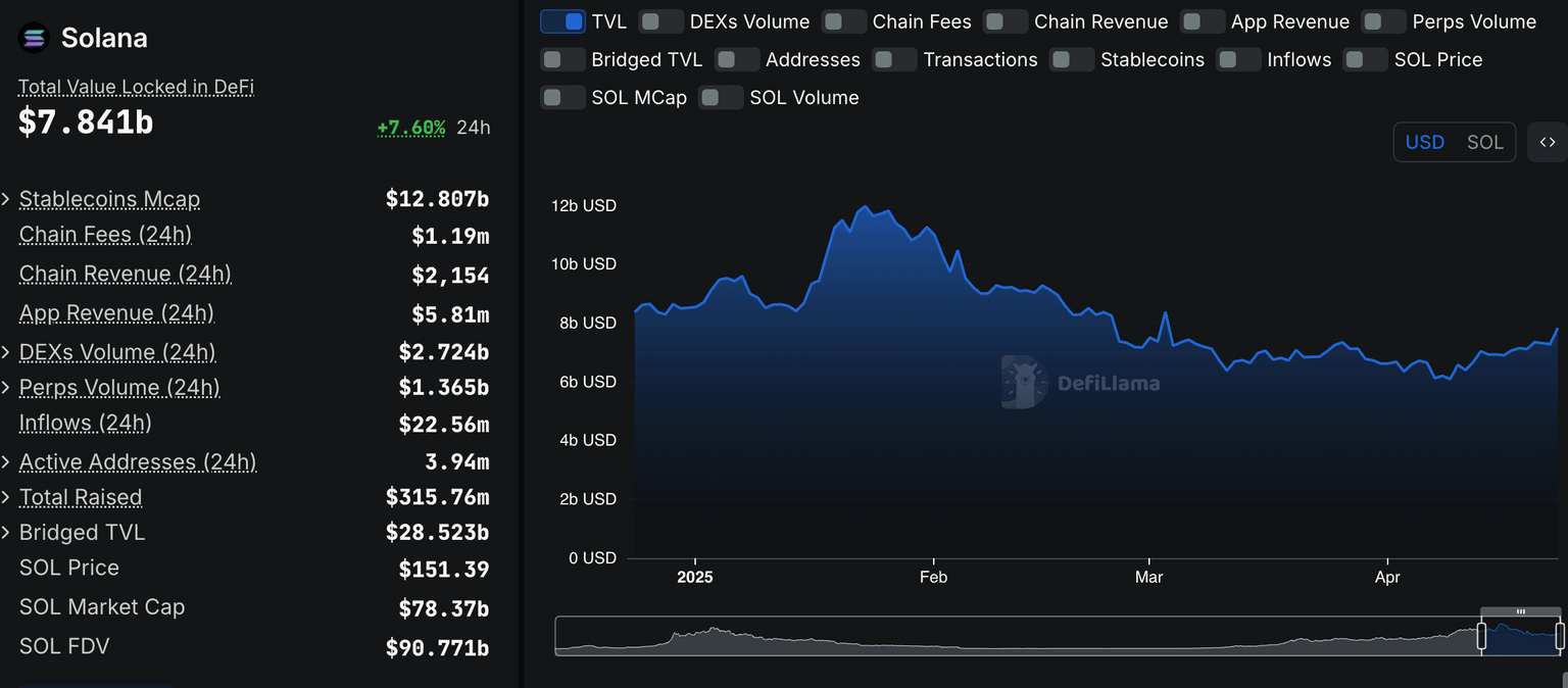 According to DefiLlama, Solana TVL plummeted to approximately $6.9 billion in April after peaking at $11.99 billion in February. As Solana's price recovered amid a growing risk-on sentiment in the broader cryptocurrency market following the suspension of reciprocal tariffs for 90 days in the United States (US), the TVL increased. Confidence in Solana's future and stability in the crypto market triggered a 7.6% increase in the TVL to $7.84 billion.