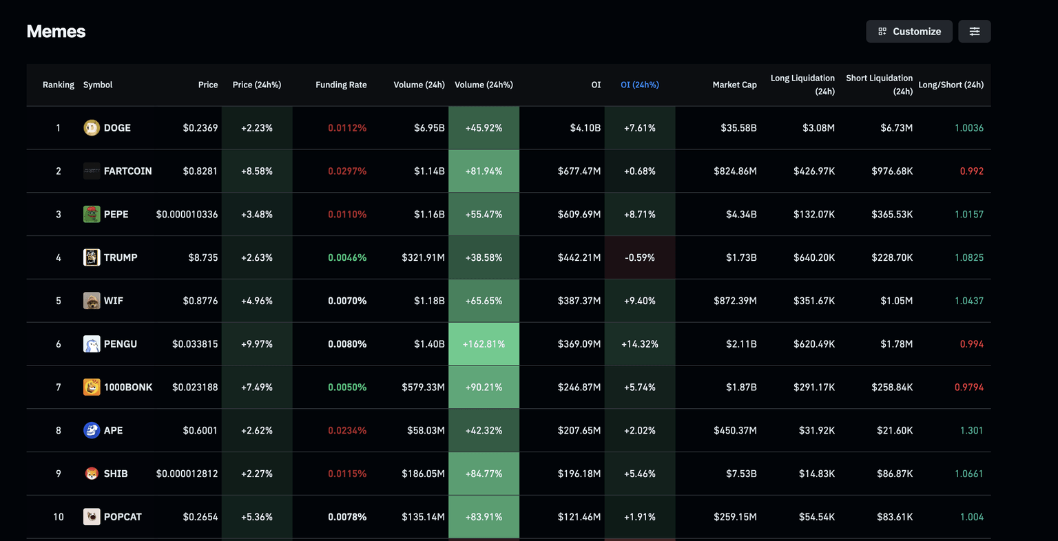 Adding to the risk-on sentiment, CoinGlass data shows the Open Interest (OI) of FARTCOIN, PENGU, and BONK has increased by nearly 1%, 15% and 6%, respectively. Notably, despite a spike in trading volumes, the long/short ratio still remains under 1, indicating a bearish imbalance in active derivatives contracts.