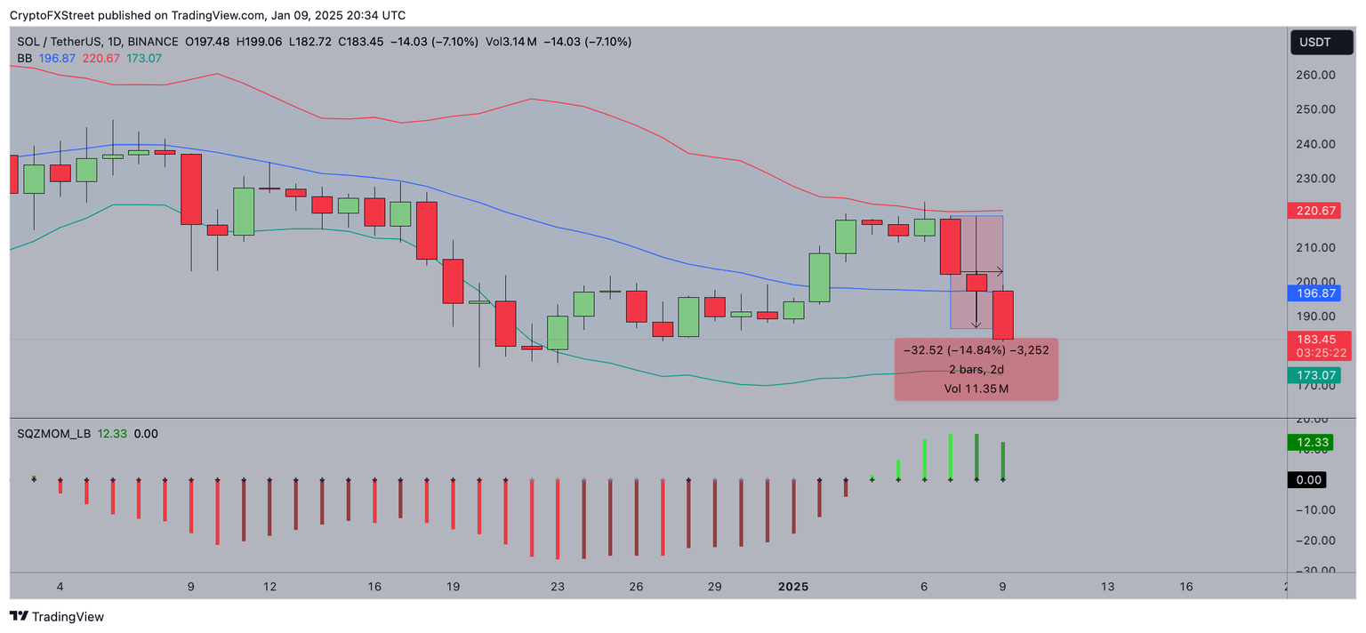 In this case, a sustained break below $183 would expose Solana to the lower Bollinger Band around $173, signaling extended selling pressure.