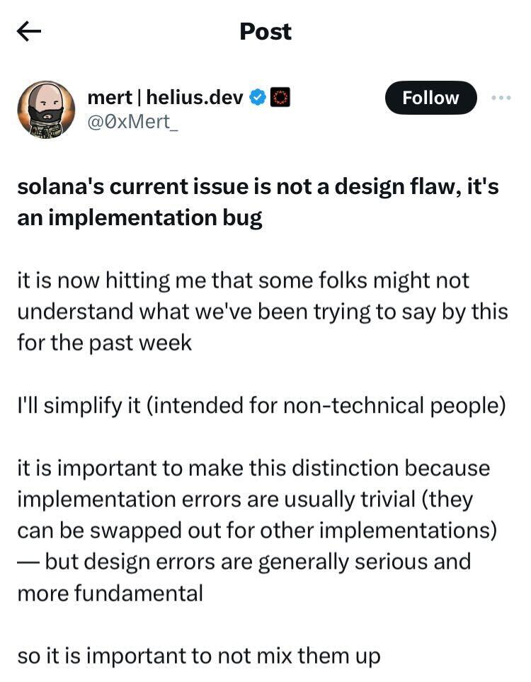 However, that doesn't mean ‘Solana’ has a design flaw — it means it chose a buggy implementation for this part of its design.