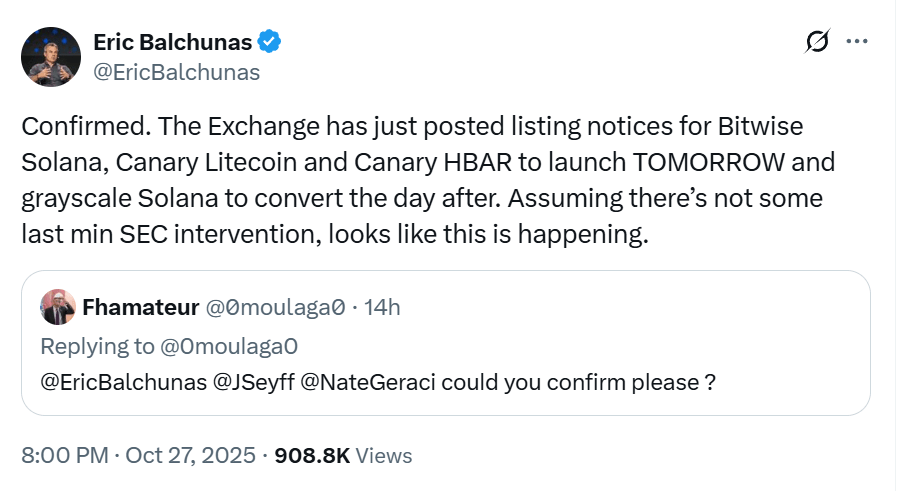 At least three altcoin ETFs are expected to launch later on Tuesday: Bitwise’s Solana (SOL $200.05) ETF and Canary’s Litecoin (LTC $101.25)and Hedera (HBAR $0.21) ETFs, according to Bloomberg analyst Eric Balchunas.