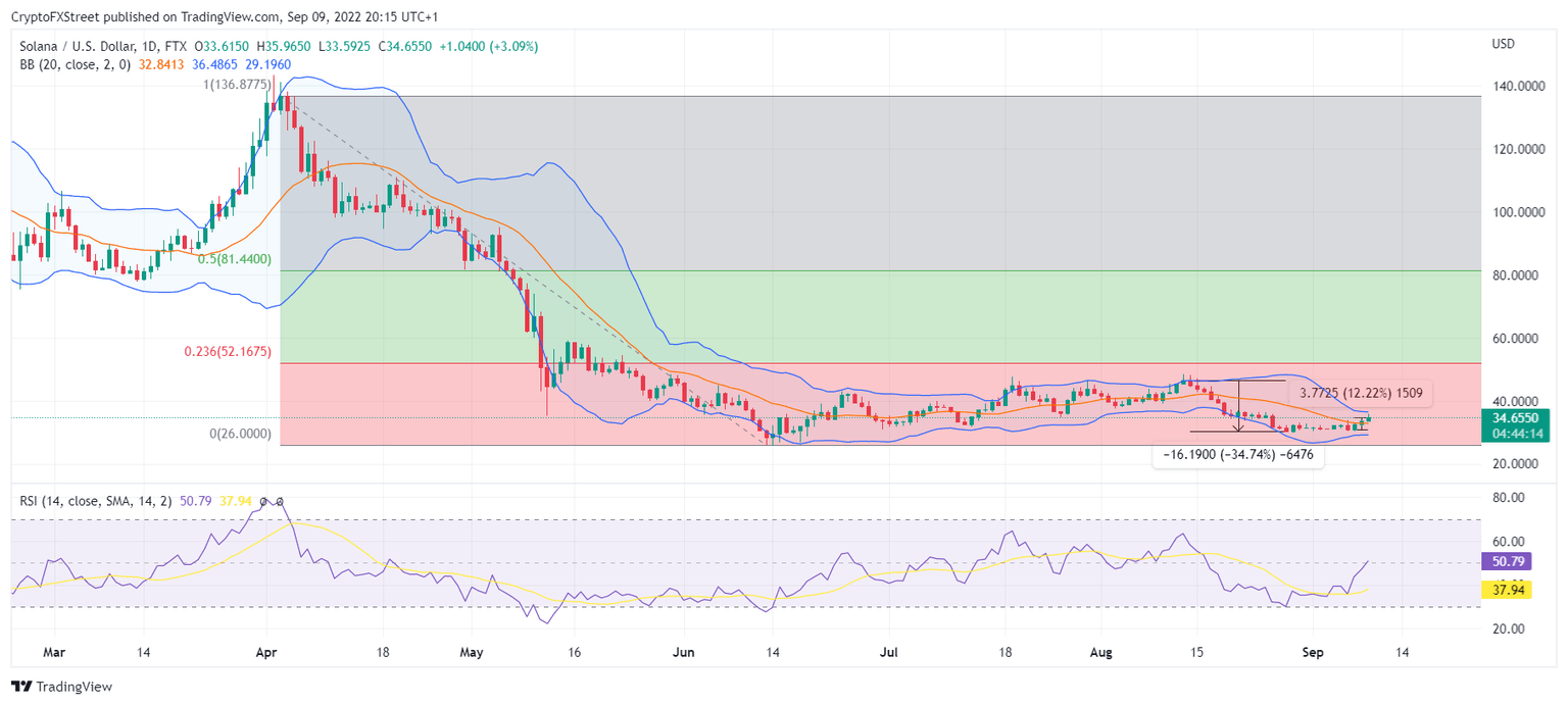 But as evinced by the narrowing Bollinger Bands, the volatility is pretty low at the moment, which means that SOL is not susceptible to any random price swings. This will sustain its gradual recovery, which is necessary currently since Solana is still below the 23.6% Fibonacci retracement level.