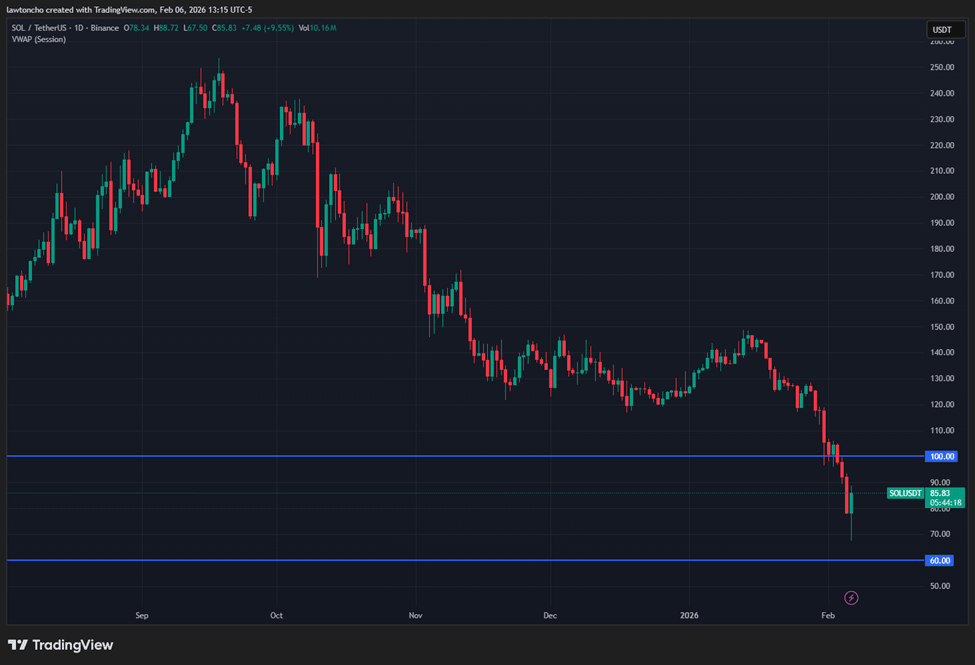 Solana (SOL) saw a strong bounce today, with price rallying more than 26% off its intraday lows. That type of move naturally catches attention, especially after the kind of downside pressure we’ve seen recently. Even with today’s rebound, it’s important to keep perspective — SOL is still down over 26% on the week. This bounce is meaningful, but it does not erase the larger drawdown that traders are reacting to.