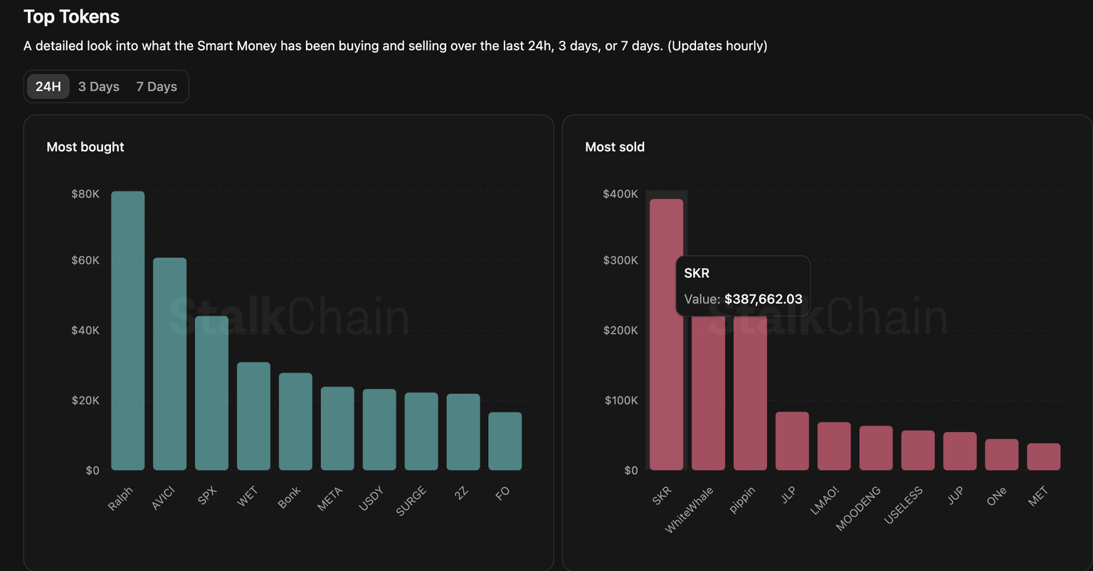 According to Stalkchain, the SKR token is one of the most sold cryptocurrencies by smart money over the last 24 hours, worth $387,662. This suggests that some large investors are shedding SKR holdings rather than staking for additional rewards, while retail demand absorbs the pressure.