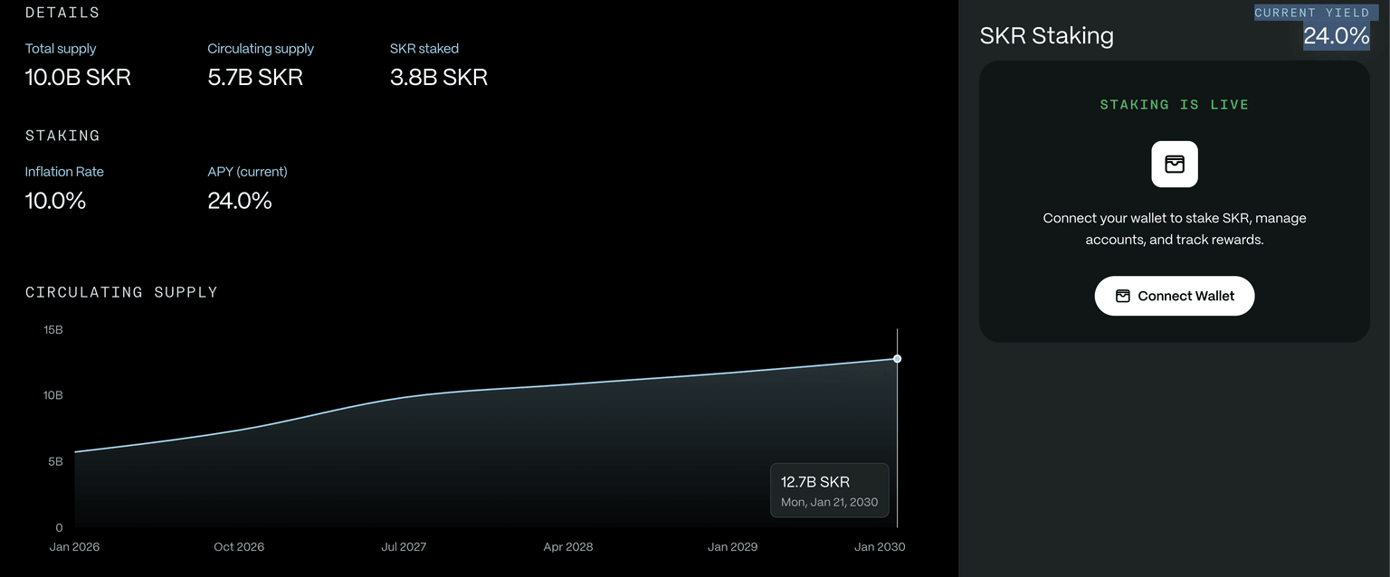 In line with the ecosystem's expansion, high SKR staking to earn rewards reflects increased user confidence. Out of the 5.7 billion circulating supply, 3.8 billion SKR tokens are staked, accounting for more than 50%. Despite the 10% inflation rate, which would increase the total supply to 12.7 billion, short-term demand overlooks the risk.