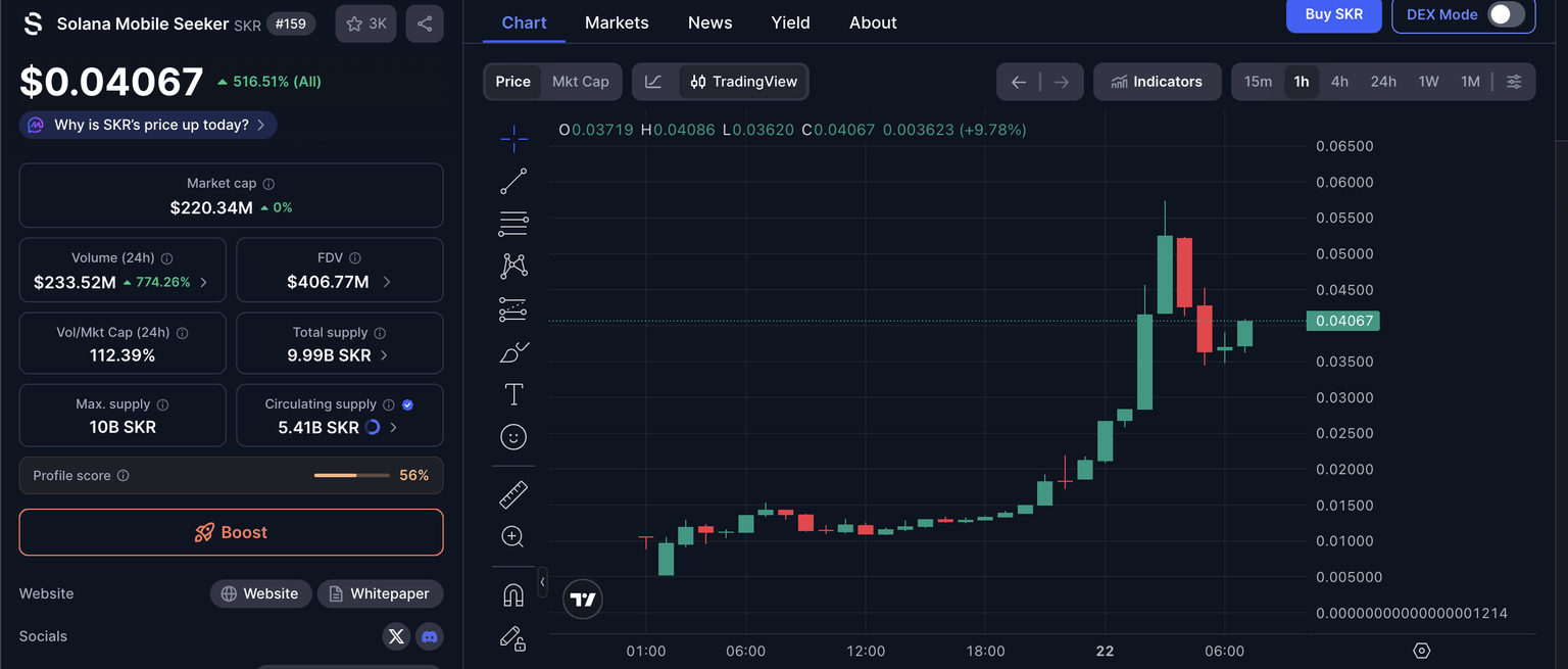 Solana Mobile Seeker (SKR) is now trading close to $0.0400 at press time on Thursday, rising from its initial listing price of $0.0010 on MEXC on Wednesday. The native token of Solana mobile, Seeker, had a smooth listing on tier-1 exchanges like Coinbase and MEXC, as well as Asian markets like Bithumb, which fueled the rally. Co-founder of Solana Labs, Anatoly Yakovenko, urged developers to build Chinese apps to boost the ecosystem, which currently offers high staking rewards, leading to more than 50% of the circulation staked.