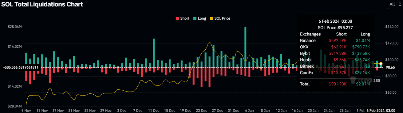Solana blockchain was compelled to pause all block productions on February 6 after a network outage. The incident contributed to the $2.07 million long positions that were liquidated in the last 24 hours. About $10 million in open interest also went down the drain, dropping from $1.36 billion to $1.35 billion between February 5 and 6.
