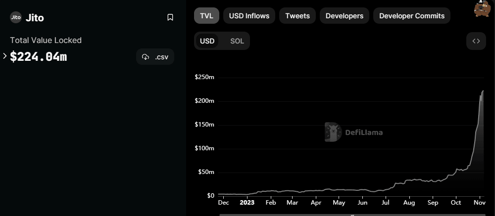 Data from Kaiko highlights the striking performance of SOL, with Solana price rising almost 115% since mid-October. It signifies a robust recovery from the FTX-infused depths around the $10.00 range in November 2022, with the research pointing to a significant growth in network activity, particularly where liquid staking token protocols such as Jito, the second liquid-staking Protocol on Solana, are concerned. Data shows that Jito has recorded up to $12 million in funding and a total value locked (TVL) of about $224 million.