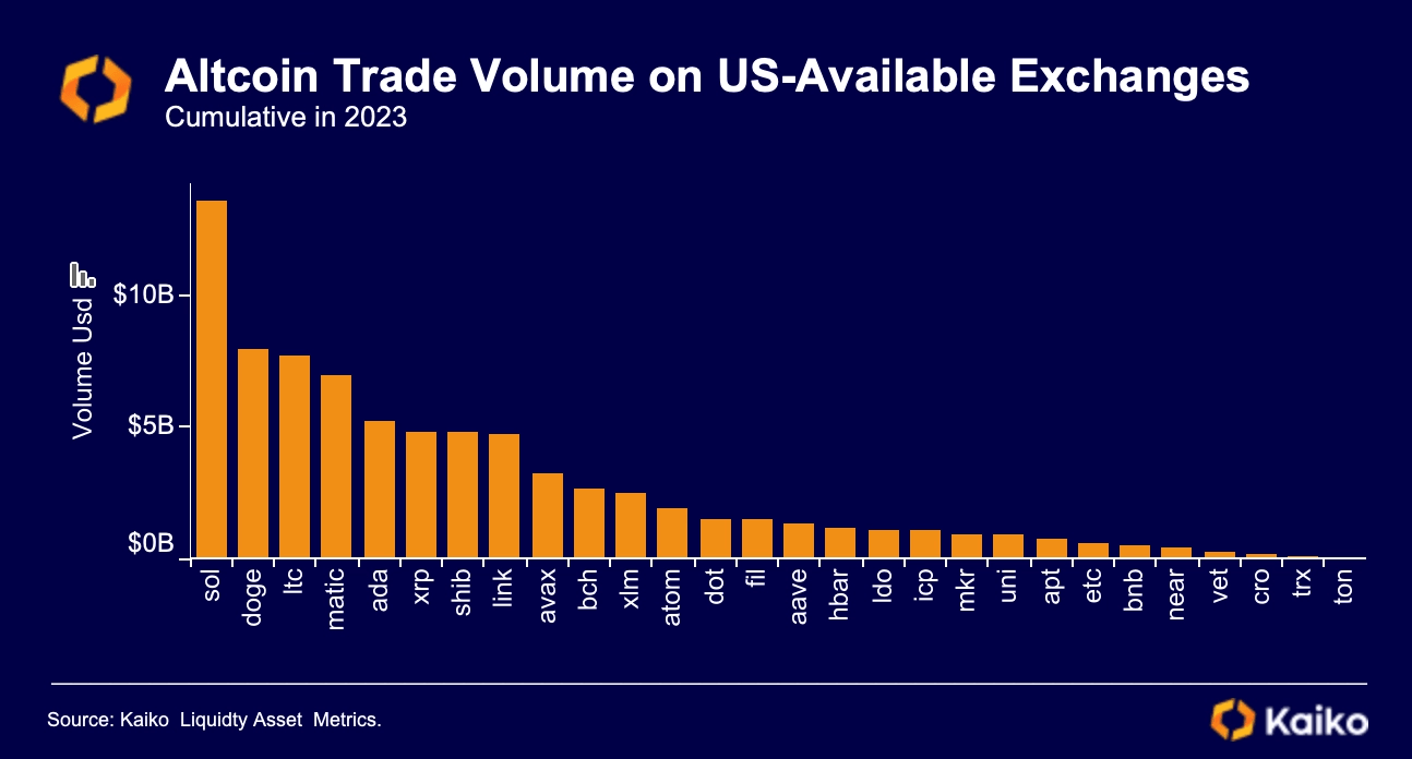 SOL is also at the very top of the list for the most-traded altcoins on US-based exchanges in 2023, outpacing Dogecoin (DOGE), Litecoin (LTC), Polygon (MATIC) and Ripple (XRP).