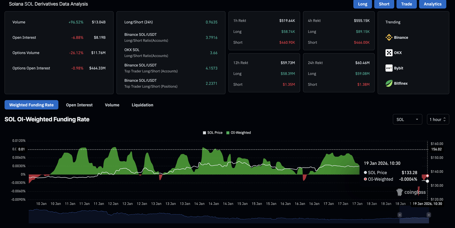 Solana derivatives record long liquidations of $59.08 million over the last 24 hours, significantly outpacing short liquidations of $1.38 million, reflecting a clear sell-side bias. The SOL futures Open Interest (OI) is down roughly 7% over the same time frame to $8.19 billion, consistent with the long liquidations. This reduction in capital at exposure in SOL derivatives reflects reduced risk appetite among traders.