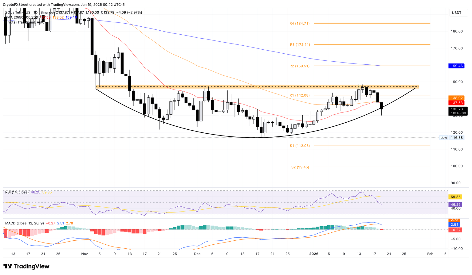 Solana remains under intense selling pressure, trading near $130 and below the 20-day and 50-day Exponential Moving Averages (EMAs) at $137-$138, tilting the near-term bias lower. A steady downward trend in Solana could breakdown the rounding bottom chart pattern from the December 18 low at $116.