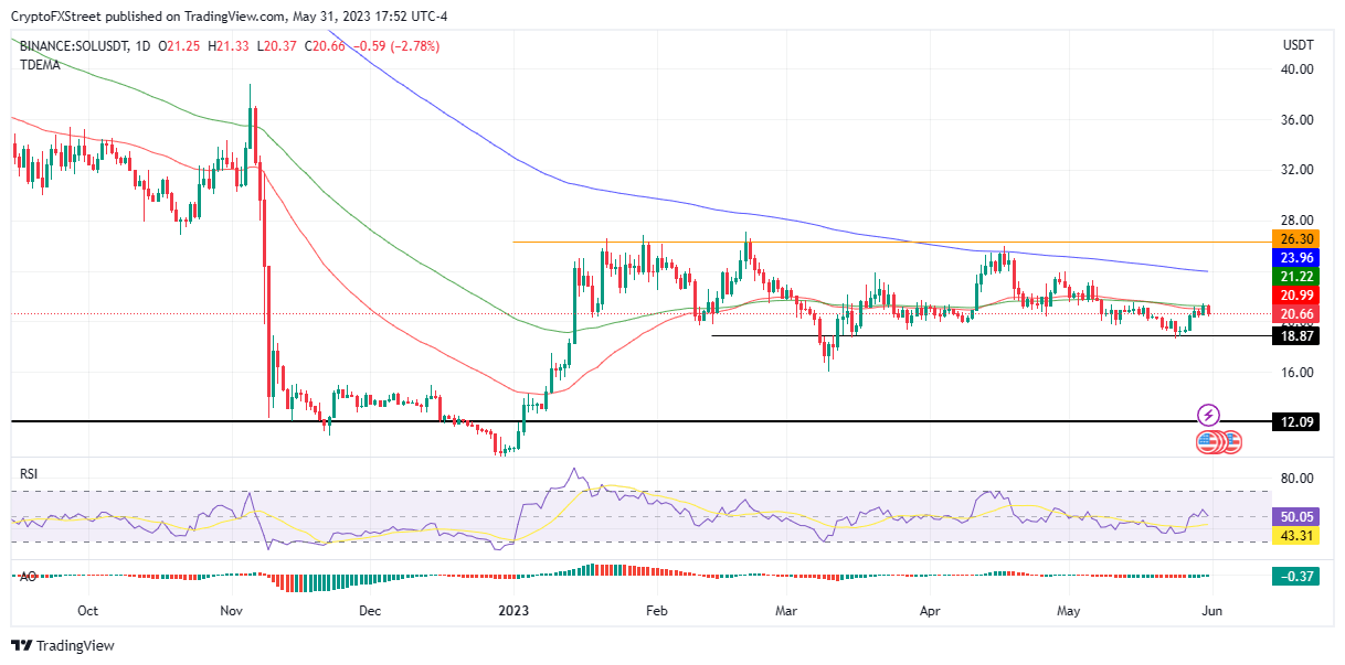 Solana (SOL) price bounced from critical support at $18.87 on May 25, rising almost 15% to a high of $21.40 on May 30. If the bullish momentum sustains, SOL could shatter above the resistance levels presented in the 50- and 100-day Exponential Moving Averages (EMA) at $20.99 and $21.22, respectively, paving the way for a confrontation with the 200-day EMA at $23.96. In a highly bullish case, the altcoin could tag $26.30, denoting a 30% leap from the current position.
