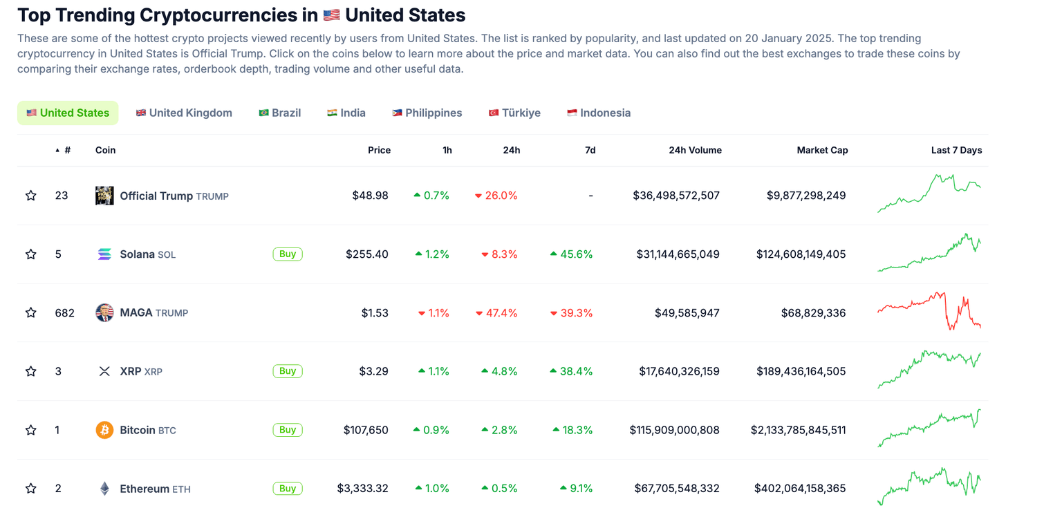 Interestingly, the newly launched Official Trump (TRUMP) coin, hosted on Solana, and the MAGA (TRUMP) token emerged as two of the top three most popular assets among US investors. Solana ranked second on the day, showcasing its growing prominence.