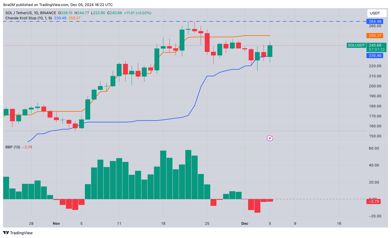 The Chande Kroll Stop indicator highlights immediate resistance at $250, suggesting that SOL may struggle to break above this level in the short term.