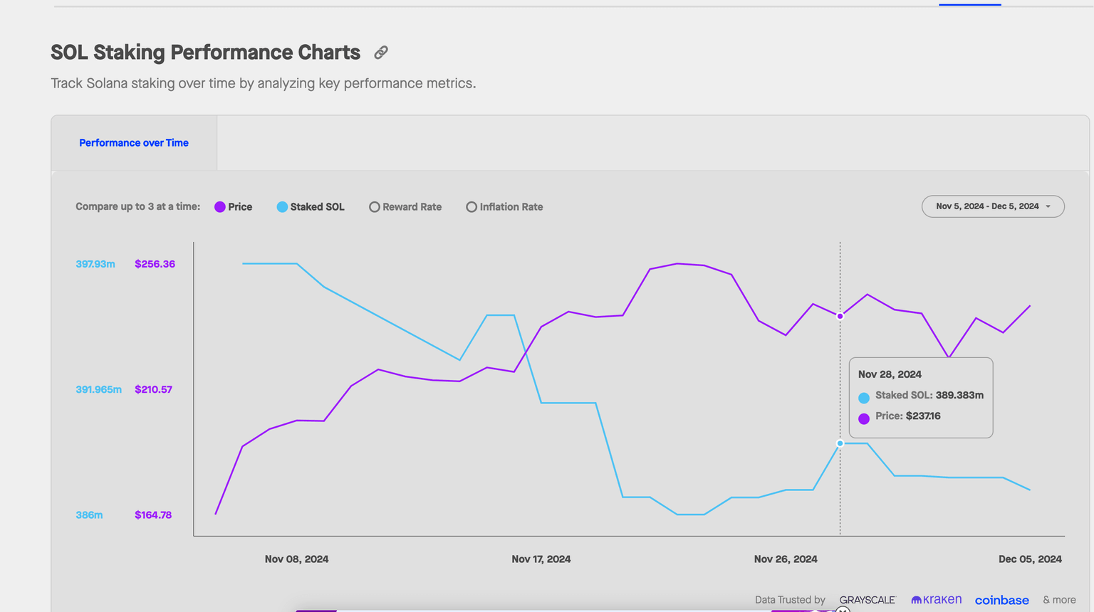 Solana’s network staking deposits have been in decline over the past week. The chart above shows the total staked value dropped from 389.4 million SOL on November 28, to hit 387.2 million SOLon Thursday.