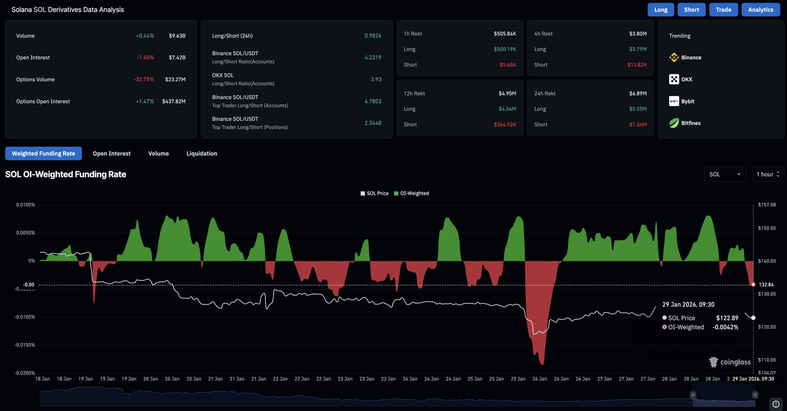 Solana is losing retail strength as capital outflows from its derivatives market reinforce risk-averse sentiment. CoinGlass data shows that SOL futures Open Interest fell 1.40% over the last 24 hours to $7.42 billion, indicating a significant positional wipeout or leverage reduction.