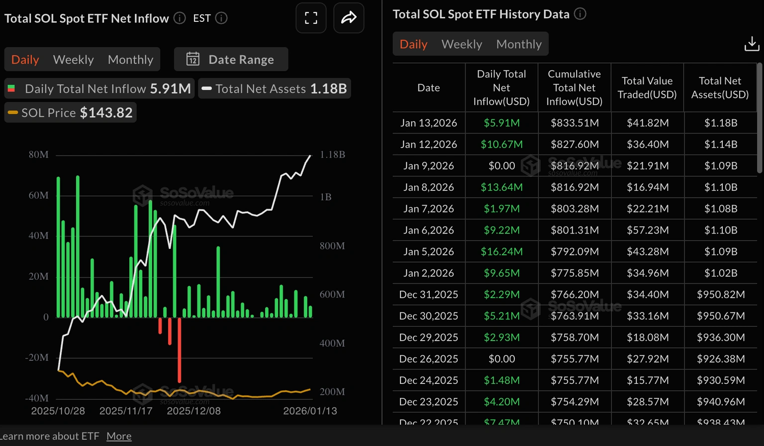 Institutional interest is materializing through Solana Exchange Traded Funds (ETFs), which recorded almost $6 million in inflows on Tuesday. Despite the mild inflow, demand for US-listed SOL spot ETFs has remained largely stable.
