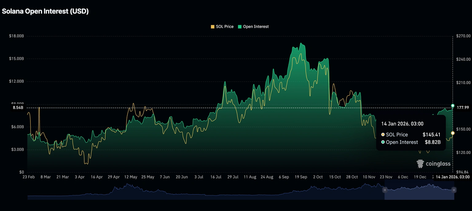 Meanwhile, the Solana derivatives market reflects investors’ optimism for a price recovery, with futures Open Interest (OI) rising to $8.8 billion on Wednesday, its highest level since early November.