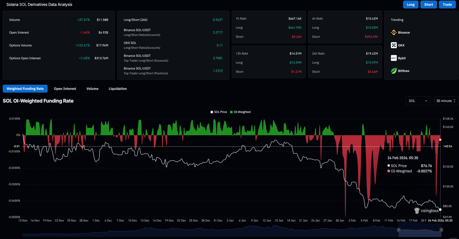 Solana approaches the 23.6% trend-based Fibonacci retracement level at $75.74, measured from the January 13 high at $148.74 to the February 15 high at $91.26, including the February 6 low at $67.50.