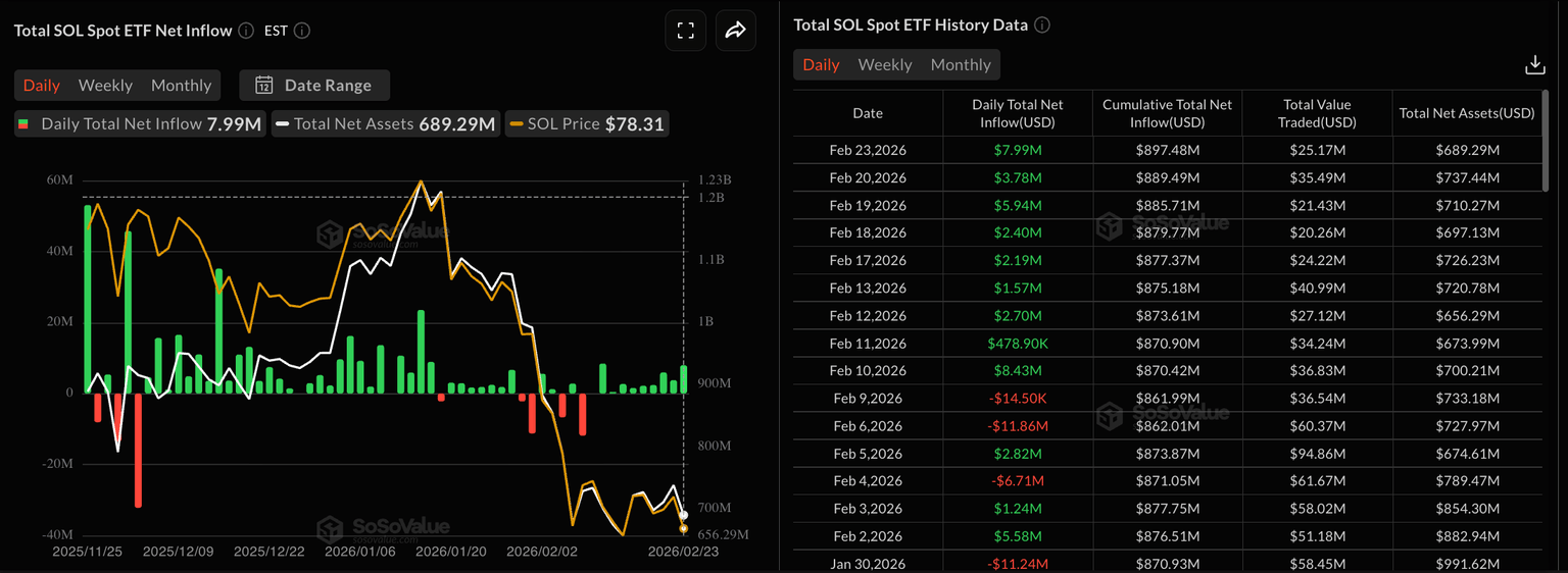Solana remains a consistent choice for institutional investors despite the broader market stress. US spot Solana ETFs recorded $7.99 million in inflows on Monday, extending the accumulation spree for the ninth consecutive trading session.